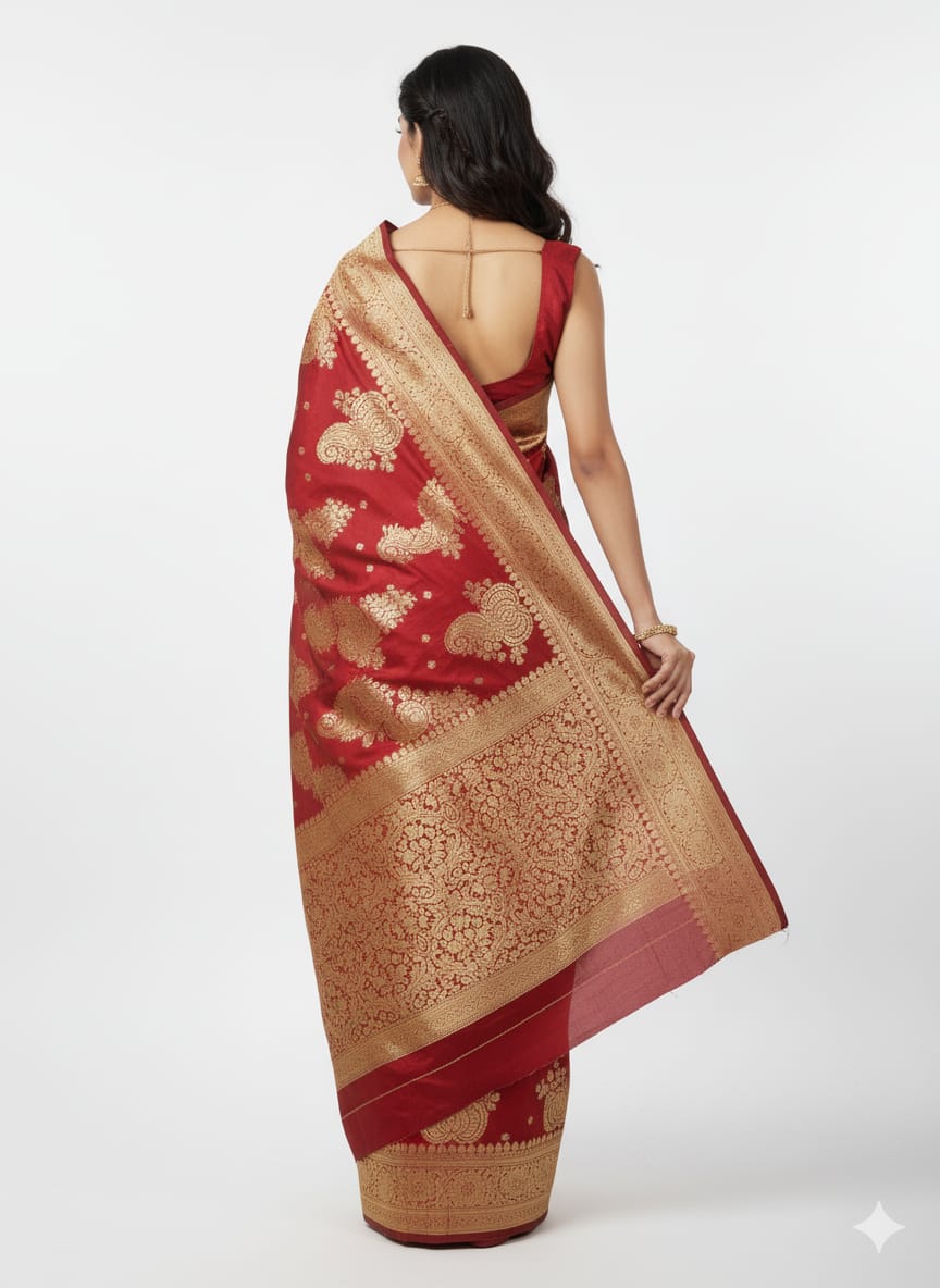 This exquisite saree comes with rich golden zari motifs inspired by Mughal artistry. Each motif is meticulously handwoven by skilled weavers to give a royal touch that stands out in bridal ensembles. The smooth silk fabric ensures absolute comfort while elegantly wrapping around the bride, making it suitable for long wedding ceremonies and photography sessions.