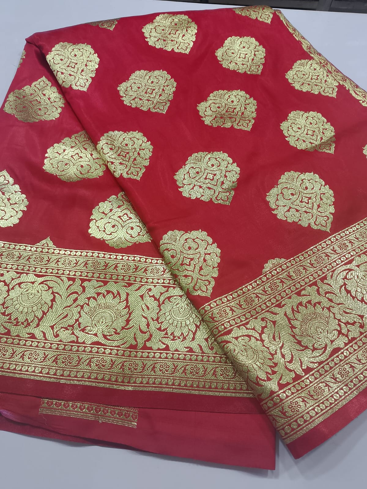 The Banarasi Bridal Saree – JBBS2 by Juss Apparels is a masterpiece of traditional craftsmanship, designed especially for brides who want to blend heritage, luxury, and elegance on their special day. Woven with superior-grade silk and adorned with intricate golden zari motifs, this saree reflects the centuries-old artistry of Banaras, celebrated for its rich textiles and royal allure. Every thread in this saree is a tribute to Indian culture, making it a timeless addition to any bridal trousseau.
