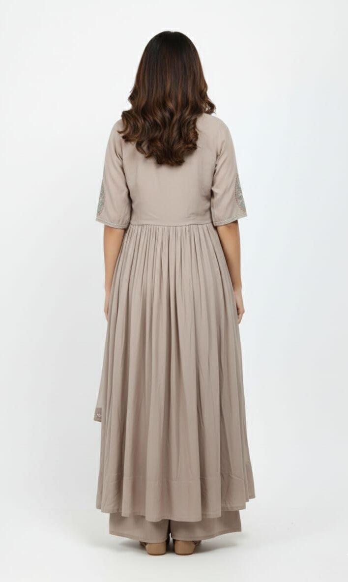 The minimal yet refined detailing of this outfit makes it versatile enough to pair with different accessories. You can style the set with statement earrings and heels for festive occasions or keep it simple with flats for a comfortable everyday look. The relaxed palazzo bottom provides ease of movement, making this set a practical choice for modern women who prefer fashionable yet functional clothing.