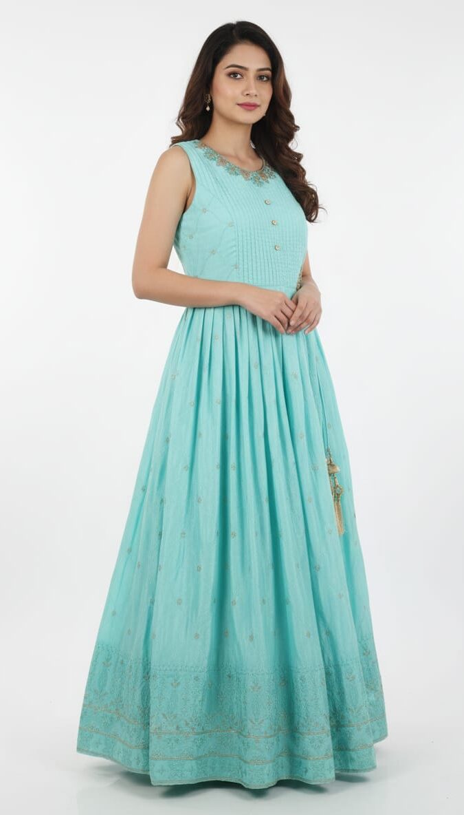 The gown is designed to suit multiple body types with a flattering fit that enhances your natural look. The stylish ethnic design adds a royal touch, making it a standout outfit in your wardrobe. Its elegant structure and flowy style create a beautiful appearance while keeping movement easy and comfortable. This makes it perfect for long functions, dancing, or celebrations where comfort is equally important as style.