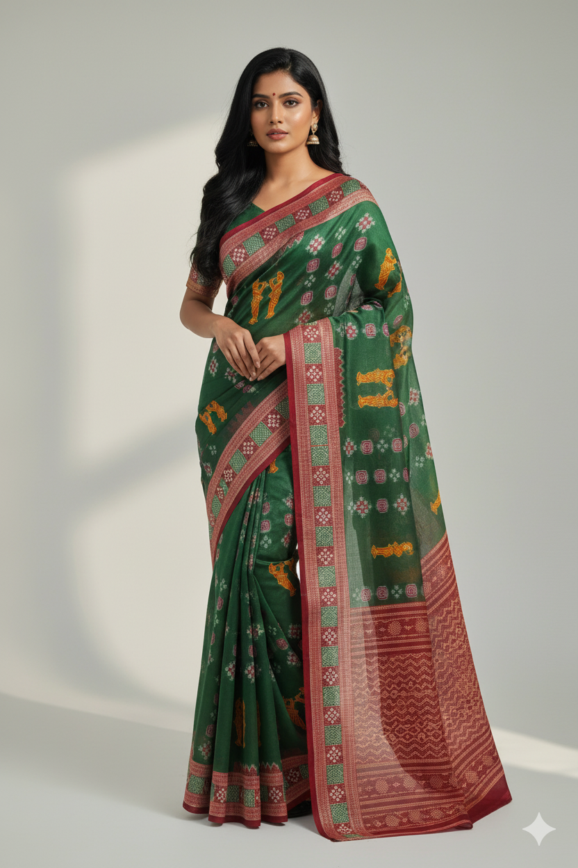 The texture of pure cotton lends a soft, natural touch to your skin while maintaining the saree’s rich body. Over time, the fabric becomes even smoother, adding character and comfort to your collection. The breathable weave ensures that you remain cool and composed — perfect for India’s tropical climate and beyond.