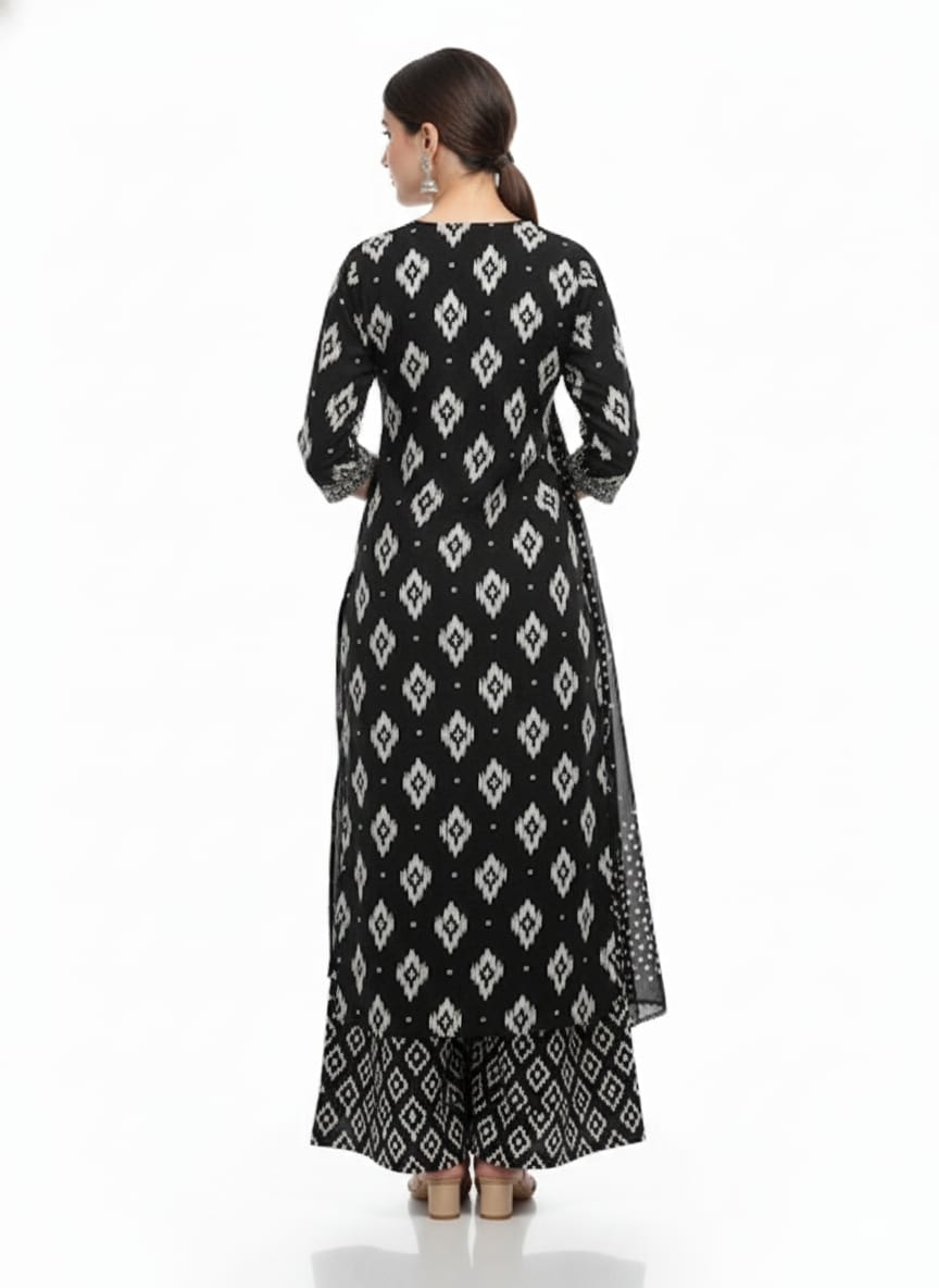 The kurta showcases a refined design that balances simplicity and style. Its modern cut with subtle detailing makes it easy to accessorize for different occasions. The coordinating plazo pants complement the top beautifully, adding graceful movement and a comfortable fit that enhances your overall look.