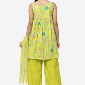 The kurta features a modern yet timeless design that can be styled for multiple occasions. Its clean lines and elegant detailing allow you to accessorize according to your personal style. The coordinating plazo pants add a flowy and graceful touch, completing the outfit with a relaxed and sophisticated appeal.