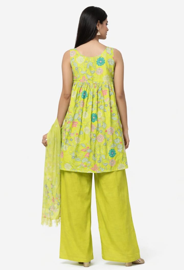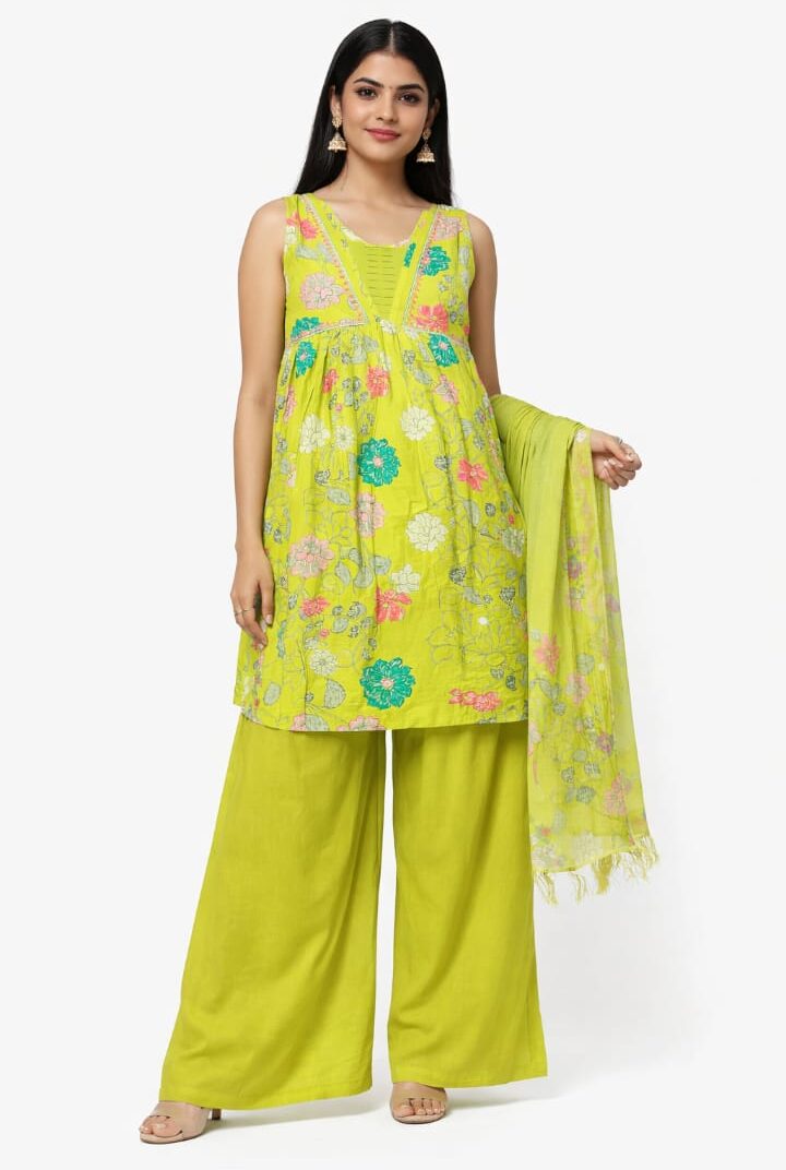 The kurta showcases a refined and contemporary look while maintaining a traditional appeal. Its subtle yet stylish detailing makes it easy to dress up or down depending on the occasion. The coordinating plazo pants provide a relaxed fit with elegant movement, completing the outfit with a graceful flow.