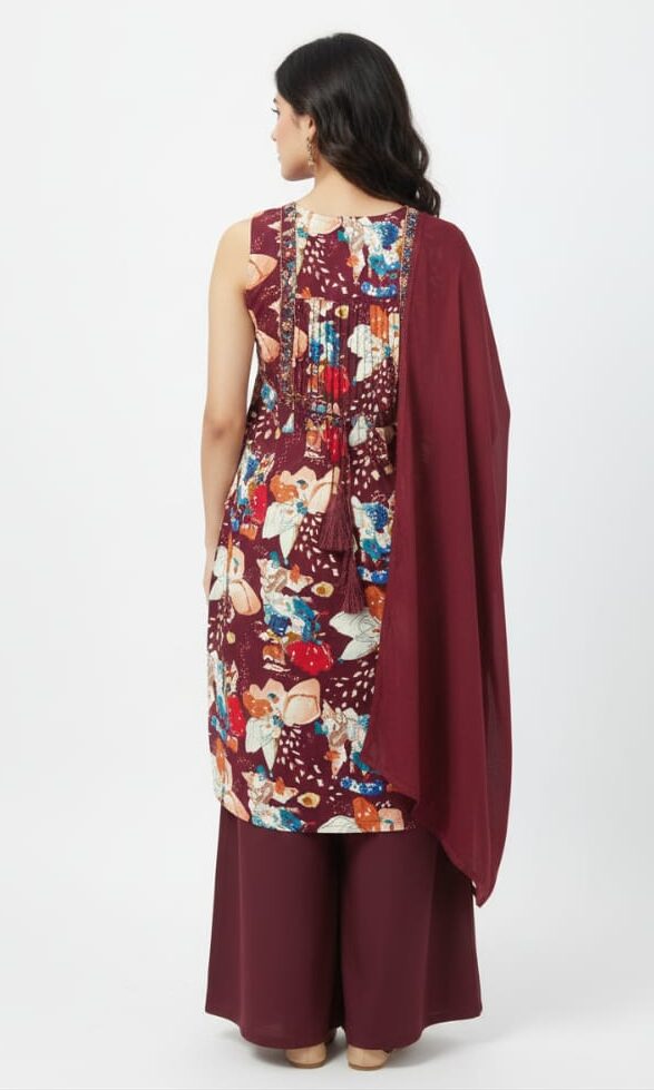 The JPLS47 Plazo Set is designed to be versatile and easy to style. For a simple everyday look, pair the outfit with comfortable flats or sandals and minimal jewelry. This creates a clean and elegant appearance perfect for daily activities.