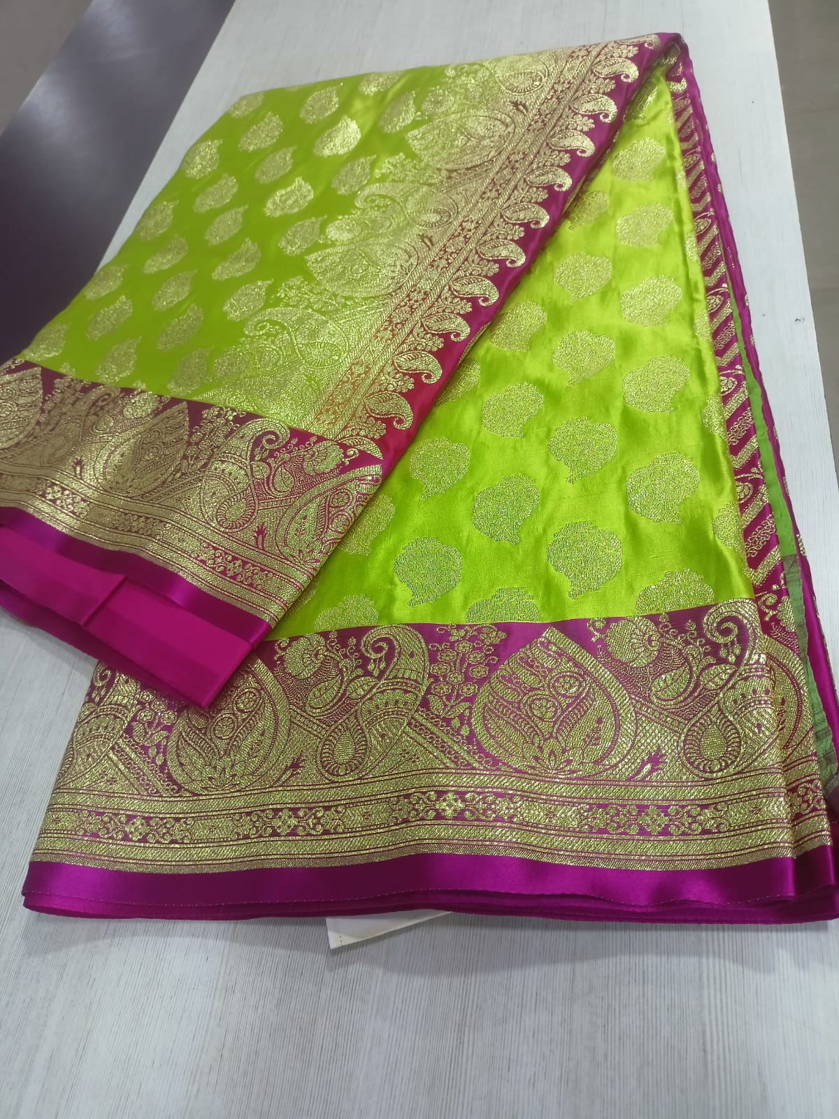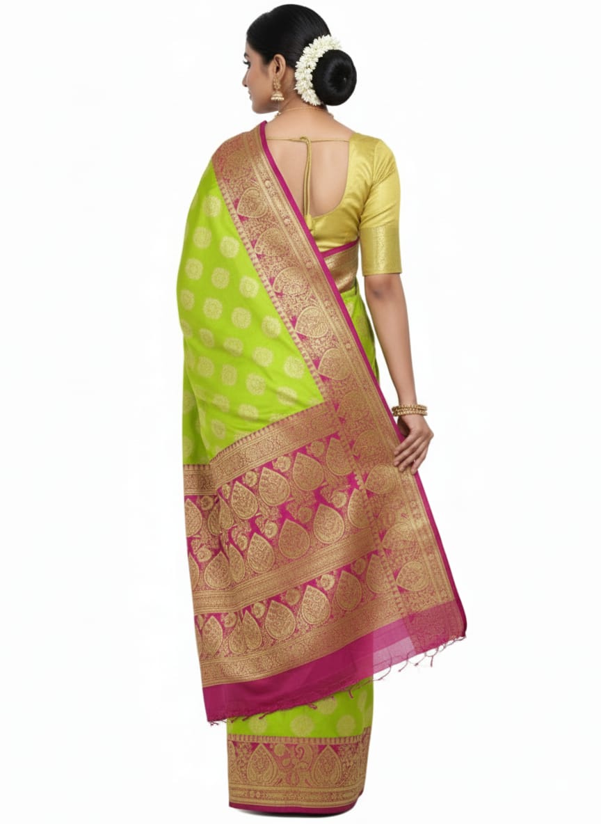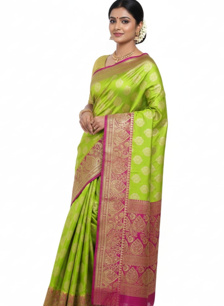 This JBBS16 edition features intricate zari work, woven into a smooth and lustrous silk base. The exquisite motifs inspired by Mughal artistry—floral vines, paisleys, and jaal patterns—enhance the regal appeal of the saree. The rich color palette combined with golden zari gives it a perfect blend of tradition and modern sophistication.