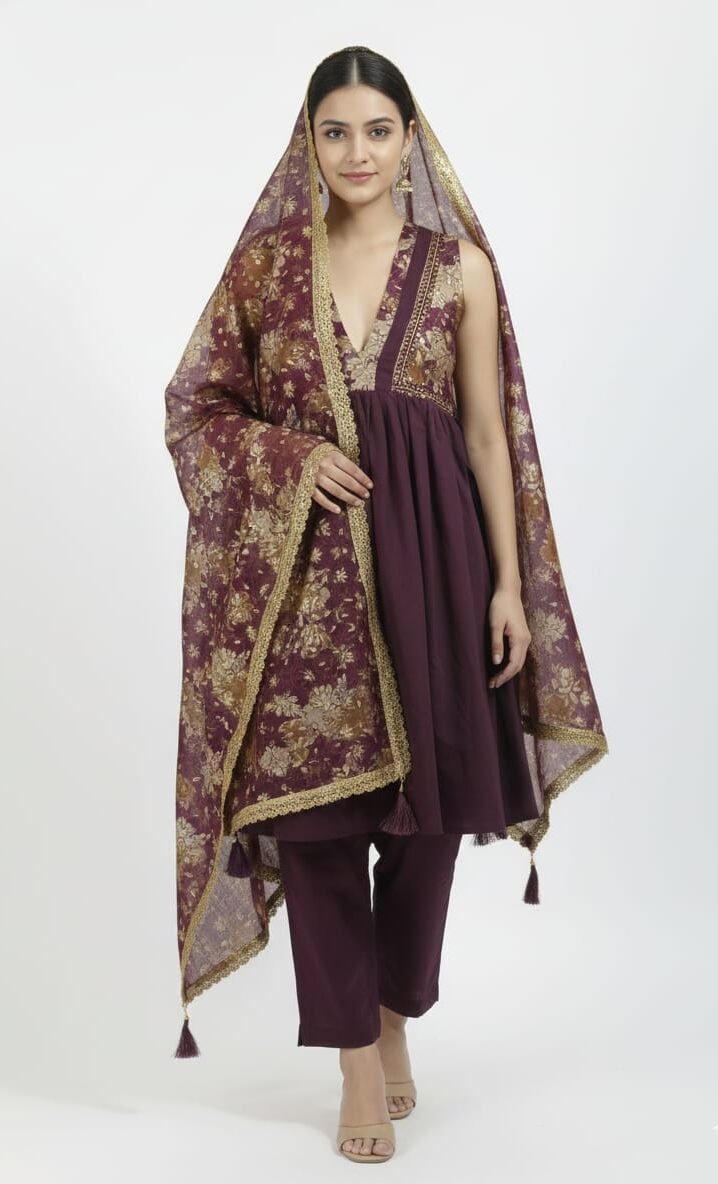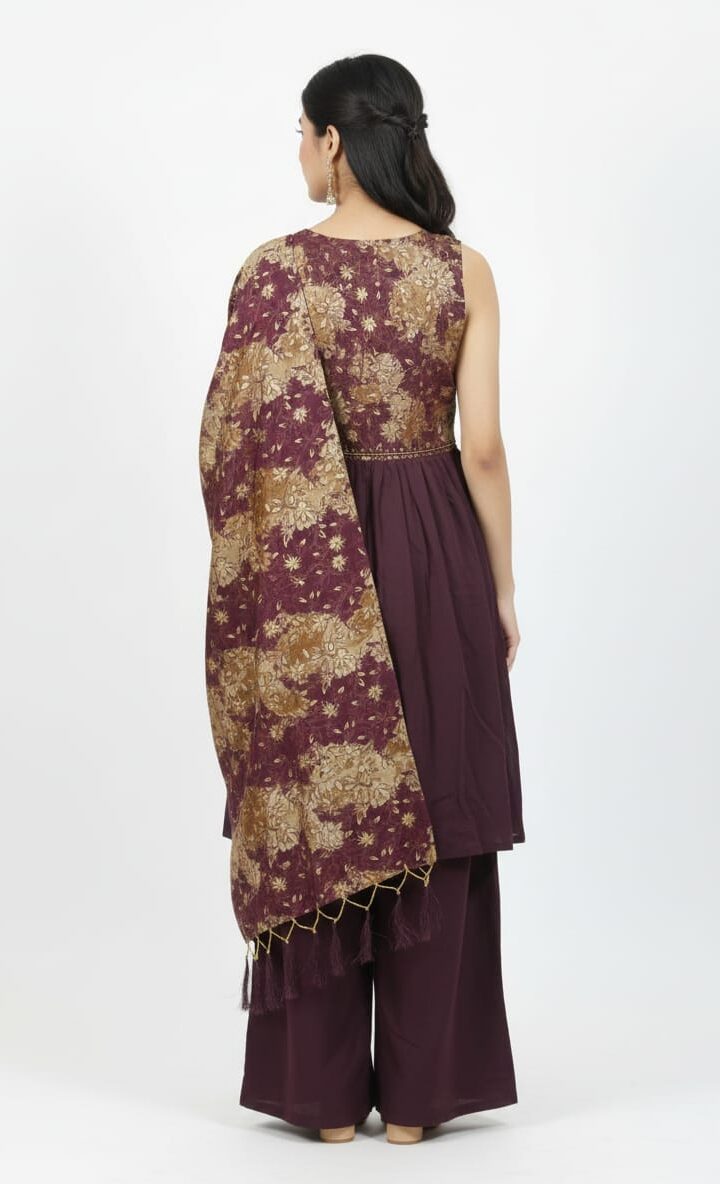 The detailing on this set reflects fine craftsmanship. From carefully stitched seams to thoughtfully chosen colors, every element speaks of premium quality. The fabric drapes beautifully, offering both structure and fluidity. Whether styled with minimal accessories for a subtle daytime look or paired with statement jewelry for evening elegance, this plazo set adapts effortlessly to your personal style.