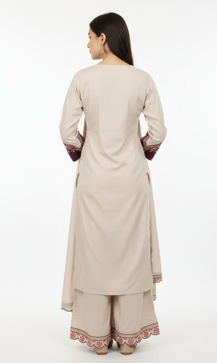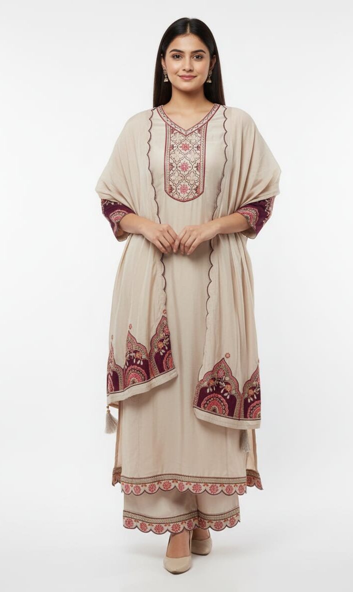 The kurti in this set features elegant detailing that adds charm and grace to your look. With its refined patterns, subtle prints, or intricate embroidery, the kurti is designed to make a statement while maintaining a balanced and sophisticated appearance. The flattering silhouette suits various body types, providing a comfortable and confident fit. The neckline and sleeve design are thoughtfully crafted to blend traditional aesthetics with modern fashion trends.