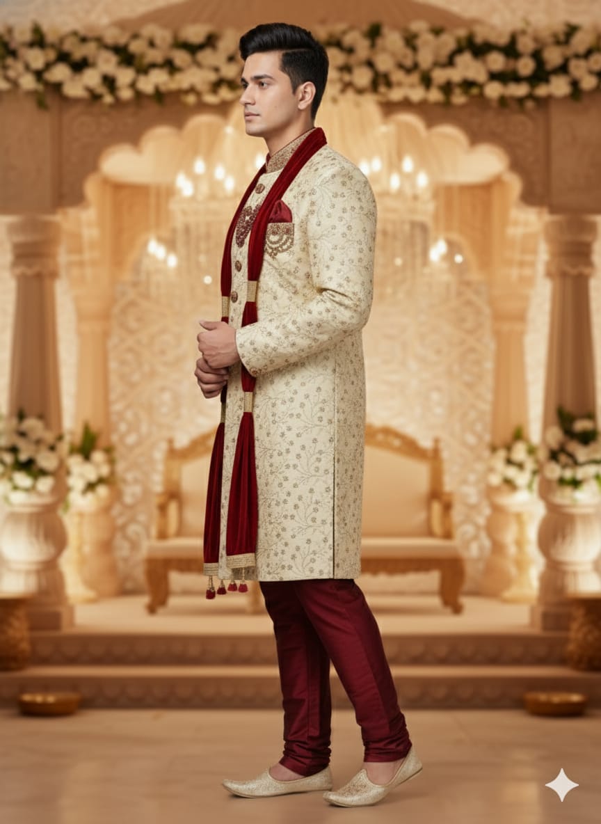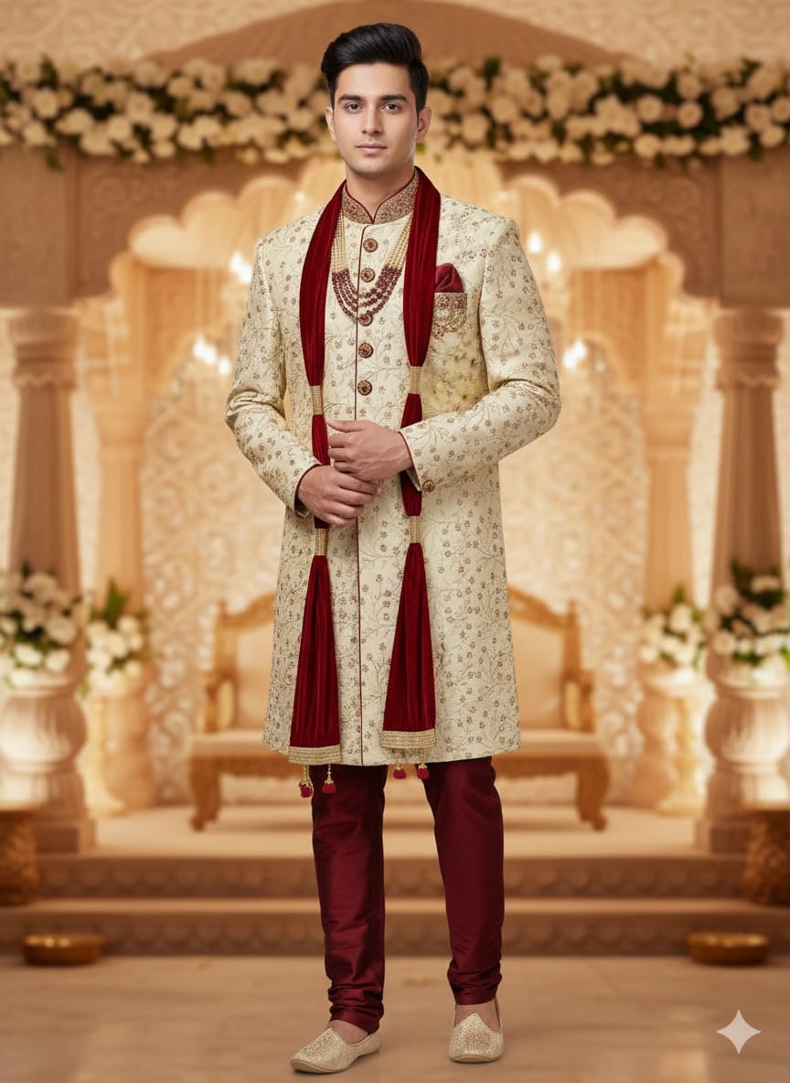 This sherwani features an exquisite design inspired by traditional Indian royal attire. The detailing may include intricate embroidery, woven patterns, zari work, textured surface, or premium embellishments depending on the design variation. The silhouette is tailored to create a sharp, structured, and regal look while ensuring comfort and confident posture.