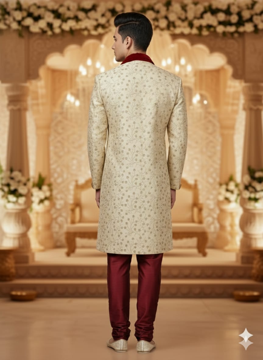 The neck design — typically bandhgala or closed collar — adds a princely touch, while the button detailing enhances the rich and luxurious appeal of the outfit.