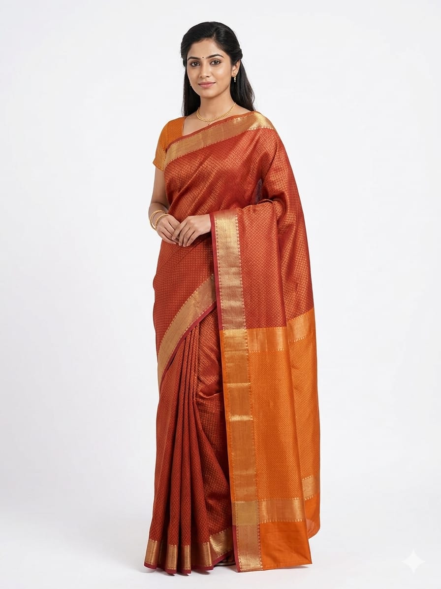 The warm rust-orange tone enhances its festive charm, making it an ideal choice for weddings, cultural events, and special occasions. Its smooth fabric ensures a comfortable drape, while the subtle intricate weaving gives it a sophisticated and timeless appeal.