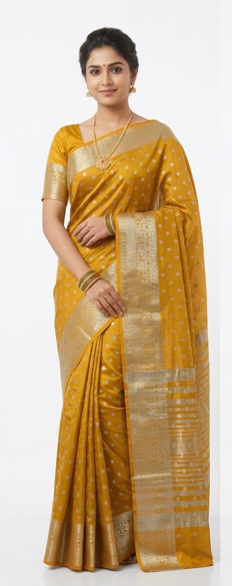 Brighten up your ethnic wardrobe with this exquisite Bangalore Silk Saree in a stunning Mustard Yellow shade. This saree is a perfect blend of traditional craftsmanship and modern minimalism, featuring a luminous texture that drapes beautifully for any occasion.
