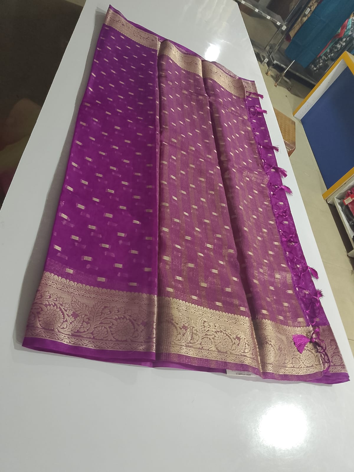 Rich Pallu: A grand zari-woven pallu with delicate tassel details adds a regal touch to your final look.